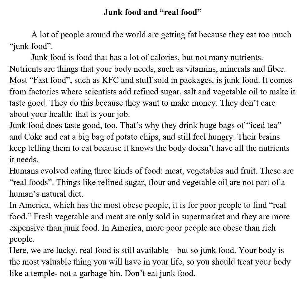 2)Junk food describes food and drinks low in nutrients (e.g. vitamins, minerals and fibre) and high in kilojoules, saturated fat, added sugar and/or added salt. Eating too much junk food is linked to serious health problems. Junk foods are not a necessary part of any diet.
