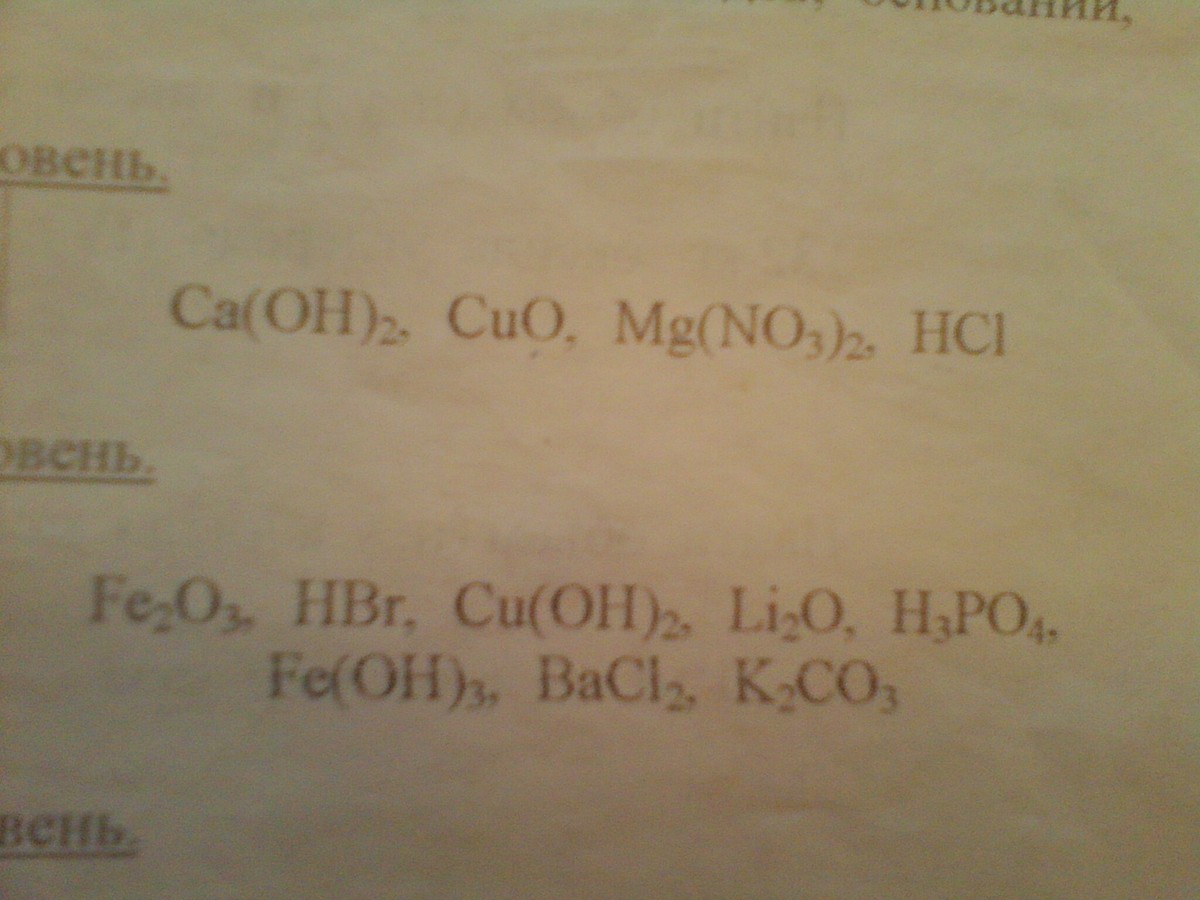 основания Ca(OH)2 (гидроксид кальция), Cu(OH)2 (гидроксид меди), Fe(OH)3 (гидроксид железа III)