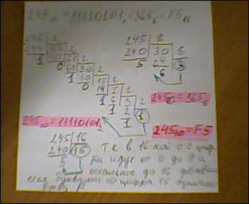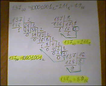 что бы из 10-ной с.с перевести в 2-ную,8-ричную,16-ричную системя счисления необходимо поделить данное число на основание с.с в которую хотим перевести числа,т.е у на число 137 (10)"в десятичной с.с" мы ходим перевести в двоичную с.с то мы число 137 делим на основание с.с (т.е на 2) до тех пор пока частное не станет меньше делимого,затем записываем ответ с последнего частного и всех последующих остатков(т.е с конца выражения) , и так же в других с.с (делим число на 8, потом делим число на 16)