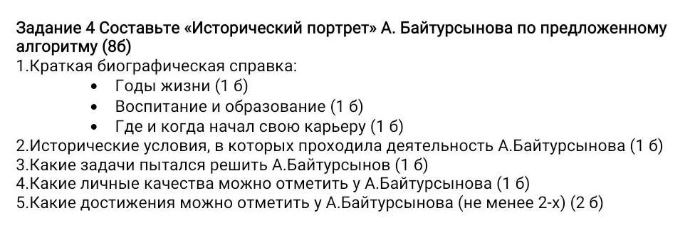 Составьте «Исторический портрет» А. Байтурсынова по предложенному алгоритму (86) 1. Краткая биографическая справка: Годы жизни (1 б) • Воспитание и образование (1 б) Где и когда начал свою карьеру (1 б) 2. Исторические условия, в которых проходила деятельность А.Байтурсынова (1 б) 3. Какие задачи пытался решить А. Байтурсынов (1 б) 4. Какие личные качества можно отметить у А.Байтурсынова
