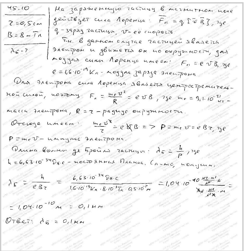 Электрон движется в магнитном поле индукцией 8 мТл по окружности радиусом 0,5 см. Определите дебройлевскую длину волны этого электрона (в нм). Ответ дайте с точность до десятых.
