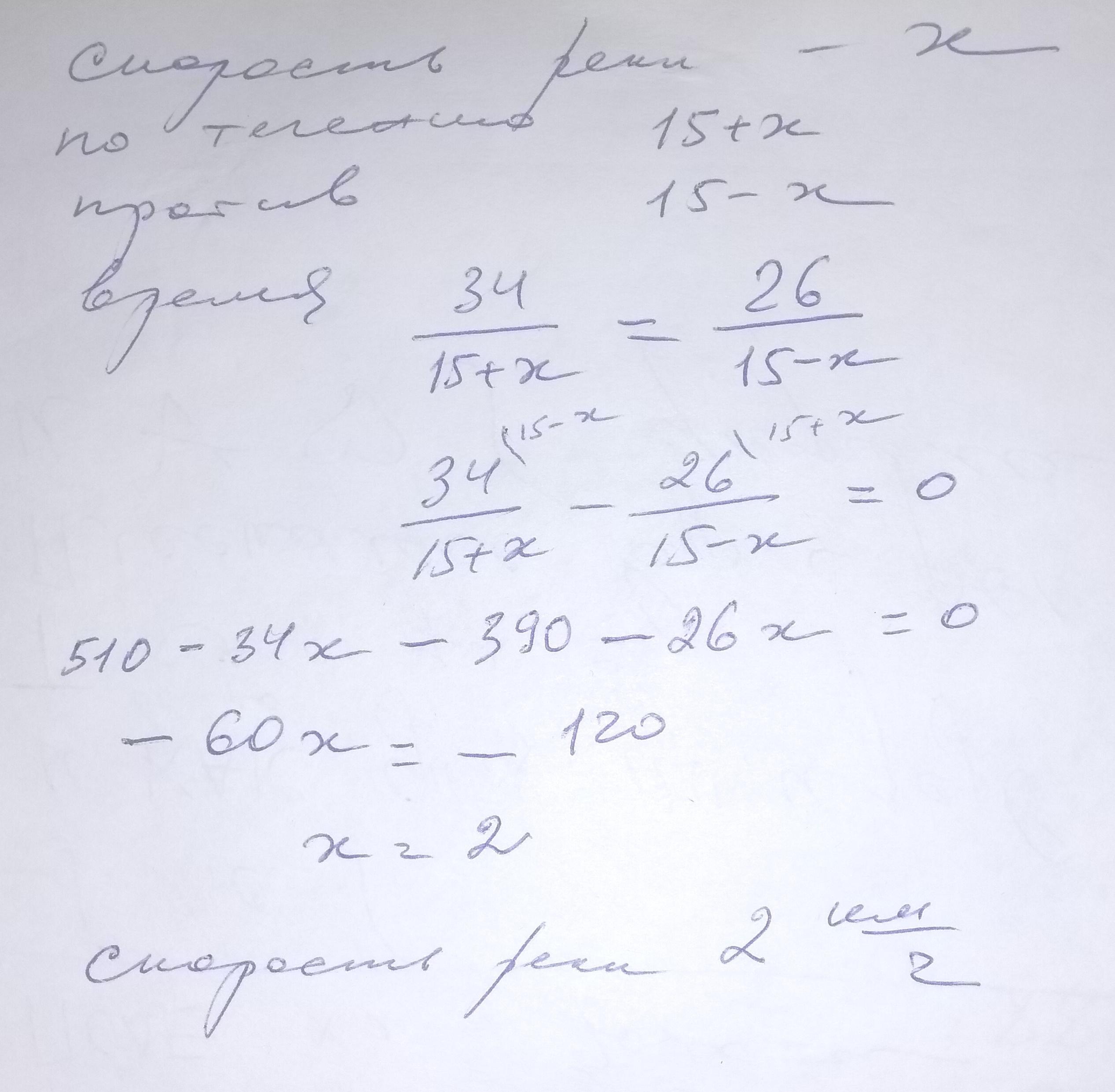 Лодка прошла 34 км вниз по течению, столько же времени она потратила на 26 км вверх по течению. Если скорость лодки 15 км / ч, найдите скорость реки.
