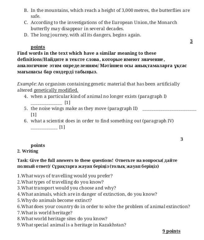 Б. В горах, которые достигают высоты 3000 метров, бабочки в безопасности. C. Согласно исследованиям Европейского Союза, бабочка Монарх может исчезнуть через несколько десятилетий. D. Долгое путешествие со всеми его опасностями начинается снова. 3 балла Найдите в тексте слова, которые имеют значение, аналогичное этим определениям / Haiiaure B TreKcre CIOBA, KOropbie HMEIOT 3HateHHe, anaiorHIHOe 3THM Oupegene HHAM / MərİHHeH OCBI aHbIKTAMaiapra ykcaci cebIHe. Пример: организм, содержащий генетический материал, который был искусственно изменен генетически. 4. когда определенный вид животных больше не существует (параграф D (1) 5. крылья шумят при движении (параграф II) [1]) 6. что делает ученый, чтобы что-то выяснить (параграф IV) ( 1] баллов 2. Письменное задание: дайте полные ответы на эти вопросы! ОТБИТЕ Ха БомпоКЛИ (gaiire no.HLit OTBET) Cypakrapra kayan õepinis (TOnLIK Kayan bepini3) 1. Какие способы путешествия вы бы предпочли? 2. Какие виды путешествий Знаете ли вы? 3. Какой транспорт вы бы выбрали и почему? 4. Какие животные, которым угрожает исчезновение, знаете ли вы? 5. Почему вымирают животные? 6. Что делает ваша страна для решения этой проблемы исчезновения животных? 7.Что такое всемирное наследие? 8. Какие объекты всемирного наследия вы знаете? 9. Какие особые животные являются достоянием Казахстана? 9 баллов