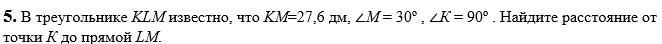 В треугольнике KLM известно, что KM=27,6 дм, ∠М = 30º , ∠К = 90º . Найдите расстояние от точки К до прямой LM.