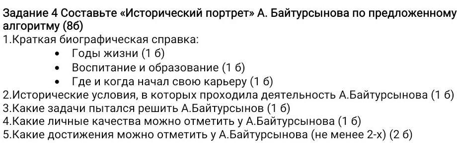 Составьте «Исторический портрет» А. Байтурсынова по предложенному алгоритму (86) 1. Краткая биографическая справка: Годы жизни (1 б) • Воспитание и образование (1 б) Где и когда начал свою карьеру (1 б) 2. Исторические условия, в которых проходила деятельность А.Байтурсынова (1 б) 3. Какие задачи пытался решить А. Байтурсынов (1 б) 4. Какие личные качества можно отметить у А.Байтурсынова