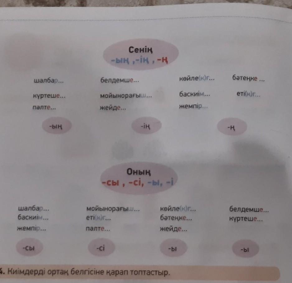 шалбары, баскиімі, жемпірі, мойыноранғышы, етігі, пәлтесі, көйлегі, бәтеңгесі, белдейі, жейдесі, белдемшесі, күрткешесі.