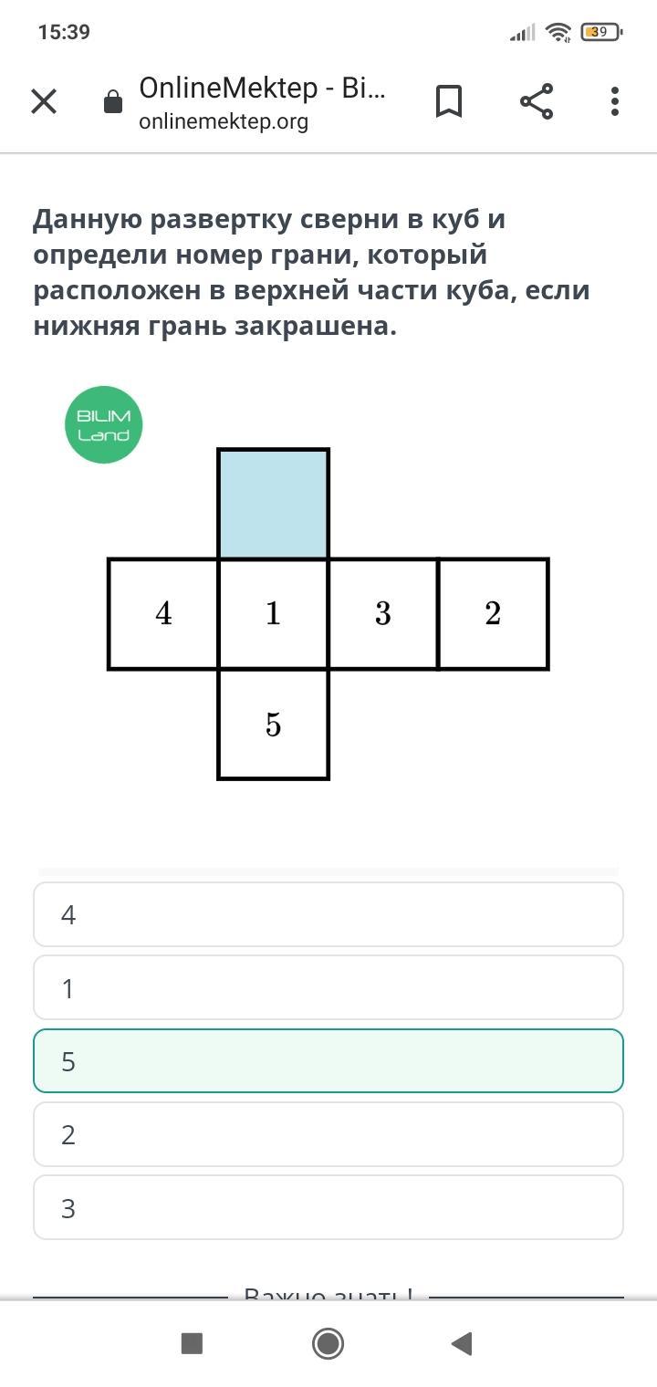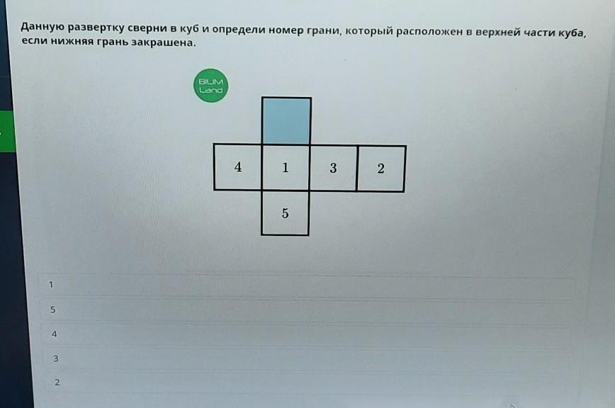 Данную развертку сверни в куб и определи номер грани, который расположен в верхней части куба,