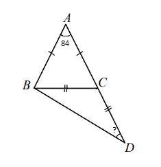 на продолжении стороны AC равнобедренного треугольника ABC с основанием BC отметили точку DТак что CD и BC а точка C Находится между точками A и D Найдите величину угла CD если угол B AC равен 84 градуса