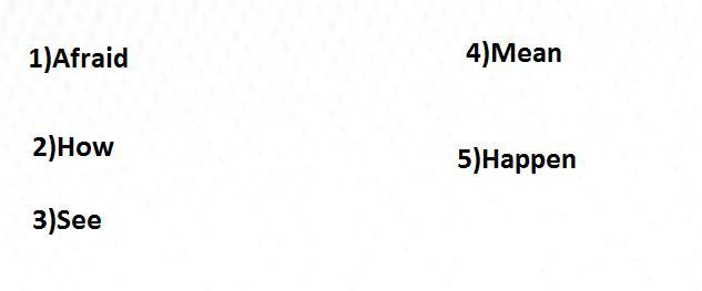 Complete the dialogue with the words in the box. see happen afraid mean how A: What's wrong? B: I'm (1) A: Really? B: I don't know (2) III. I burnt your birthday cake. it happened. You (3) I set the timer but then a friend called. A: Your girlfriend? B: No, Sally's not my girlfriend. Anyway, I forgot the cake was still in the oven. I didn't (4) A: Well, you know I don't like it when other girls call you. B: I know. It won't (5) to. again.Плис побыстрей