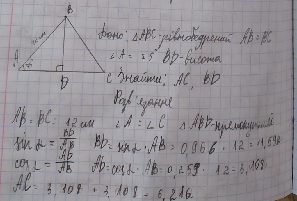 Бічна сторона рівнобедреного трикутника дорівнює 12 см, а кут при основі 75°. Знайти основу трикутника та висоту, проведену до основи.