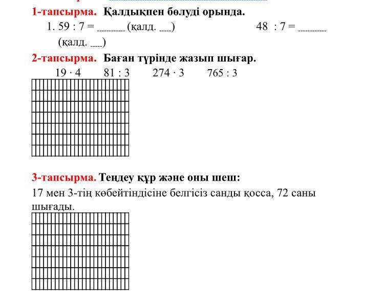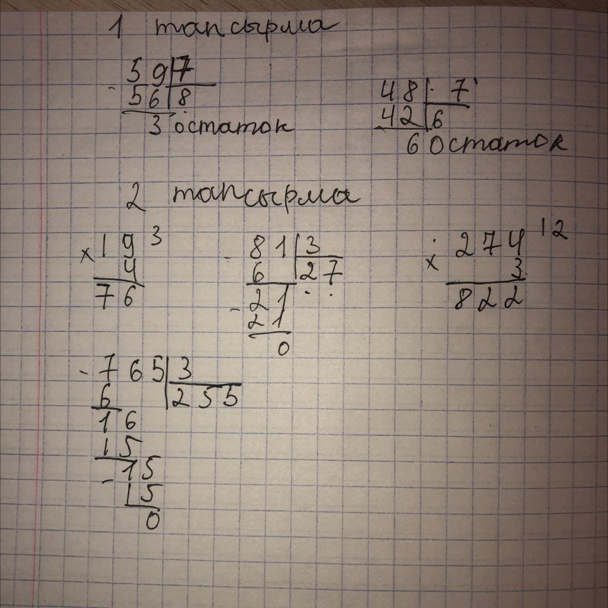 1-тапсырма 8 (3калдык) 6 (6калдык) 2-тапсырма (жауабын гана жазам) 19•4=77 81:3=27 274•3=822 765:3=255 3-тапсырма Х+17•3=72 17•3=51 Х=72-51 Х=21 21+17•3=72