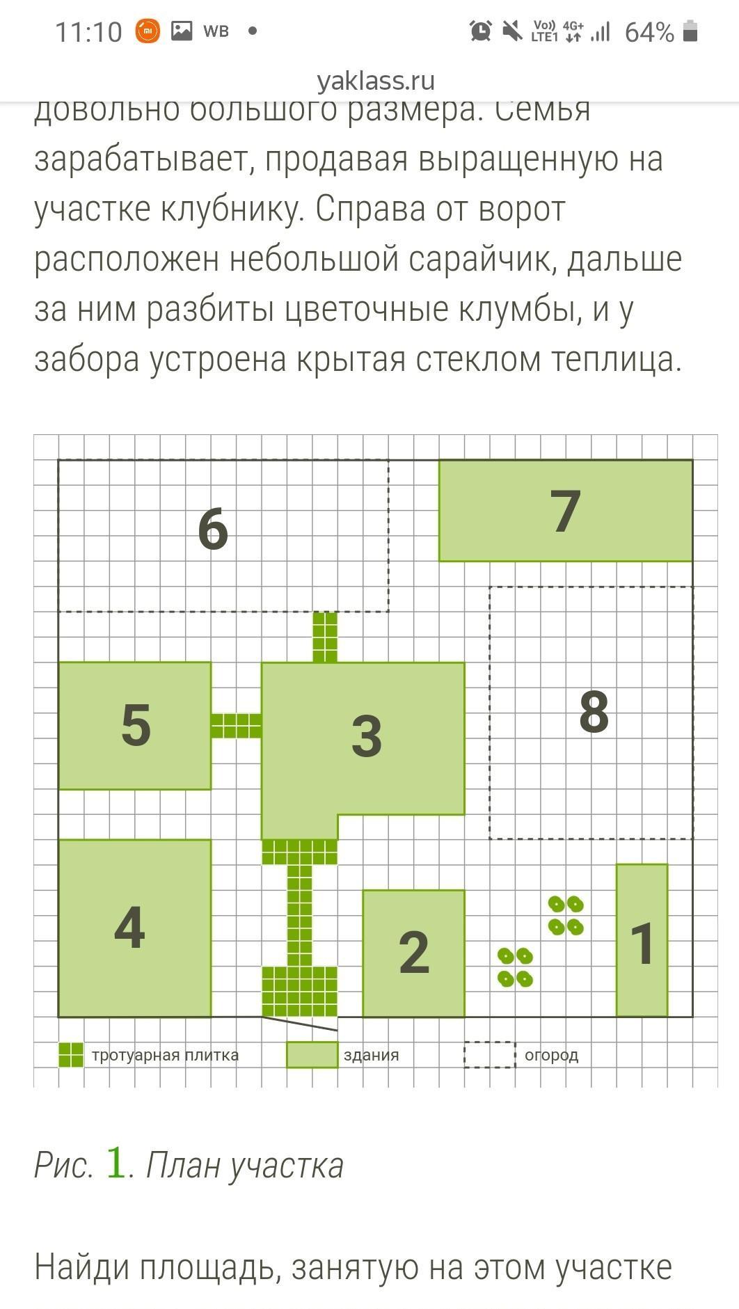 Вопрос: Найди площадь, занятую на этом участке огородом, расположенным справа от дома, если площадь клетки на плане составляет 0,3 кв. м. Ответ дай в квадратных метрах и округли до десятых.