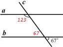 1. При пересечении прямых a и b секущей с сумма внутренних односторонних углов 123+67=190, что больше 180, следовательно прямые a и b не параллельны.