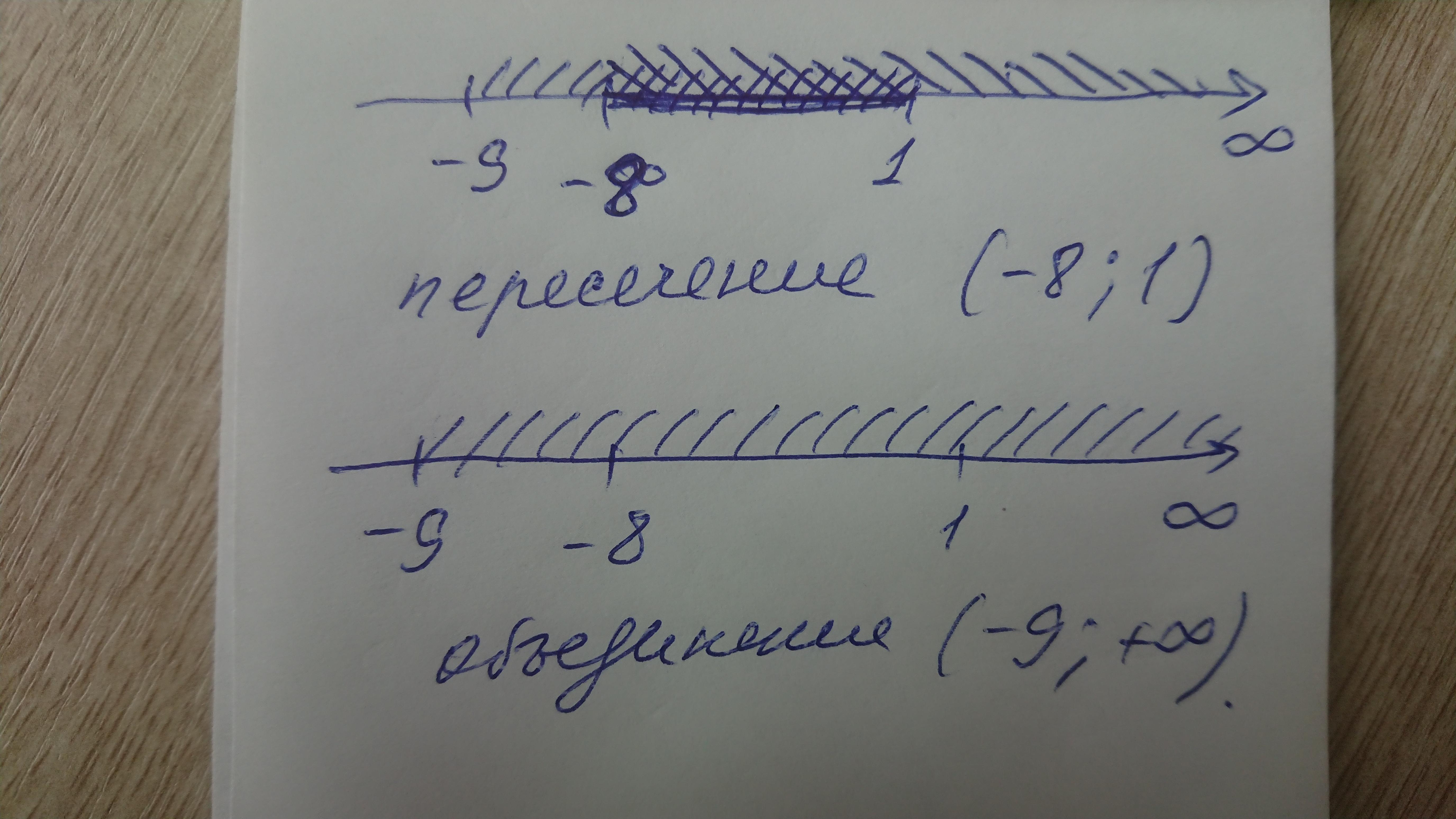 Помогите пж Изобразите на координатной прямой и запишите пересечение и объединение числовых промежутков (-9;1) и (-8;+ бесконечность)