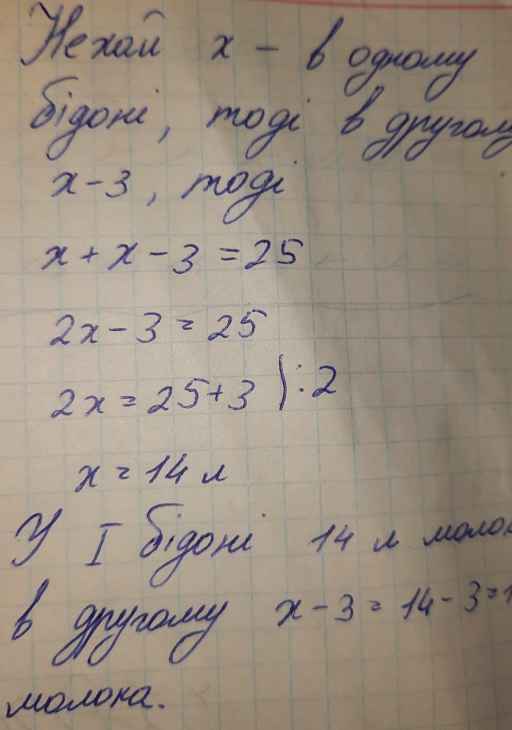 на фото, що не видно запитуйте! У 2 бідоні x-3=14-3=11 л молока