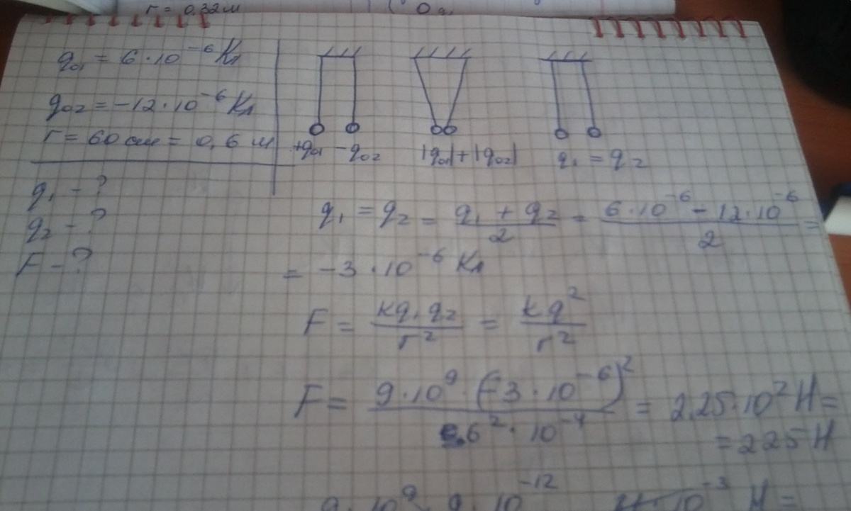 Два заряда 6 мКл и -12 мКл на расстоянии 60 см друг от друга. Определить силу взаимодействия и заряды после взаимодействия.