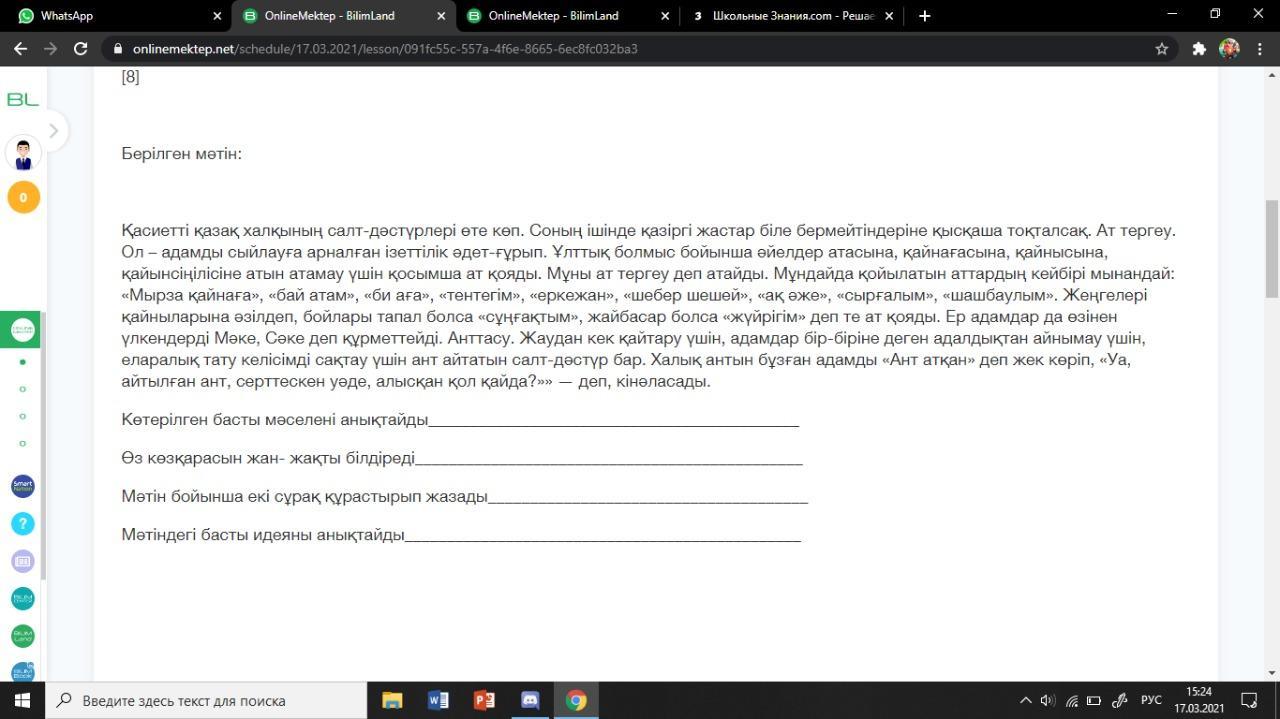 Мәтін бойынша маңызды деп санайтын екі сұрақ қойыңыз. Мәтінінің басты идеясын анықтаңыз.