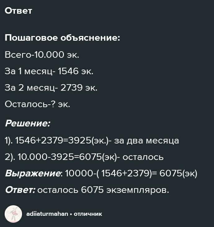 Сборник 《Сказки народов России 》выпустили тиражом 10000 экземпляров .Сколько экземпляров книги осталось на складе,если за первый месяц продали 1546 экземпляров,а за второй 2379 экземпляров?