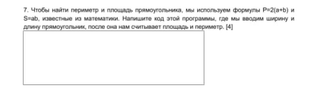 7. Чтобы найти периметр и площадь прямоугольника, мы используем формулы P=2(a+b) и S=ab, известные из математики. Напишите код этой программы, где мы вводим ширину и длину прямоугольник, после она нам считывает площадь и периметр. [4]