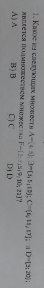 Какое из следующих множеств А=4,5;В=3,5,10;С=6,11,17;иD=3,20;