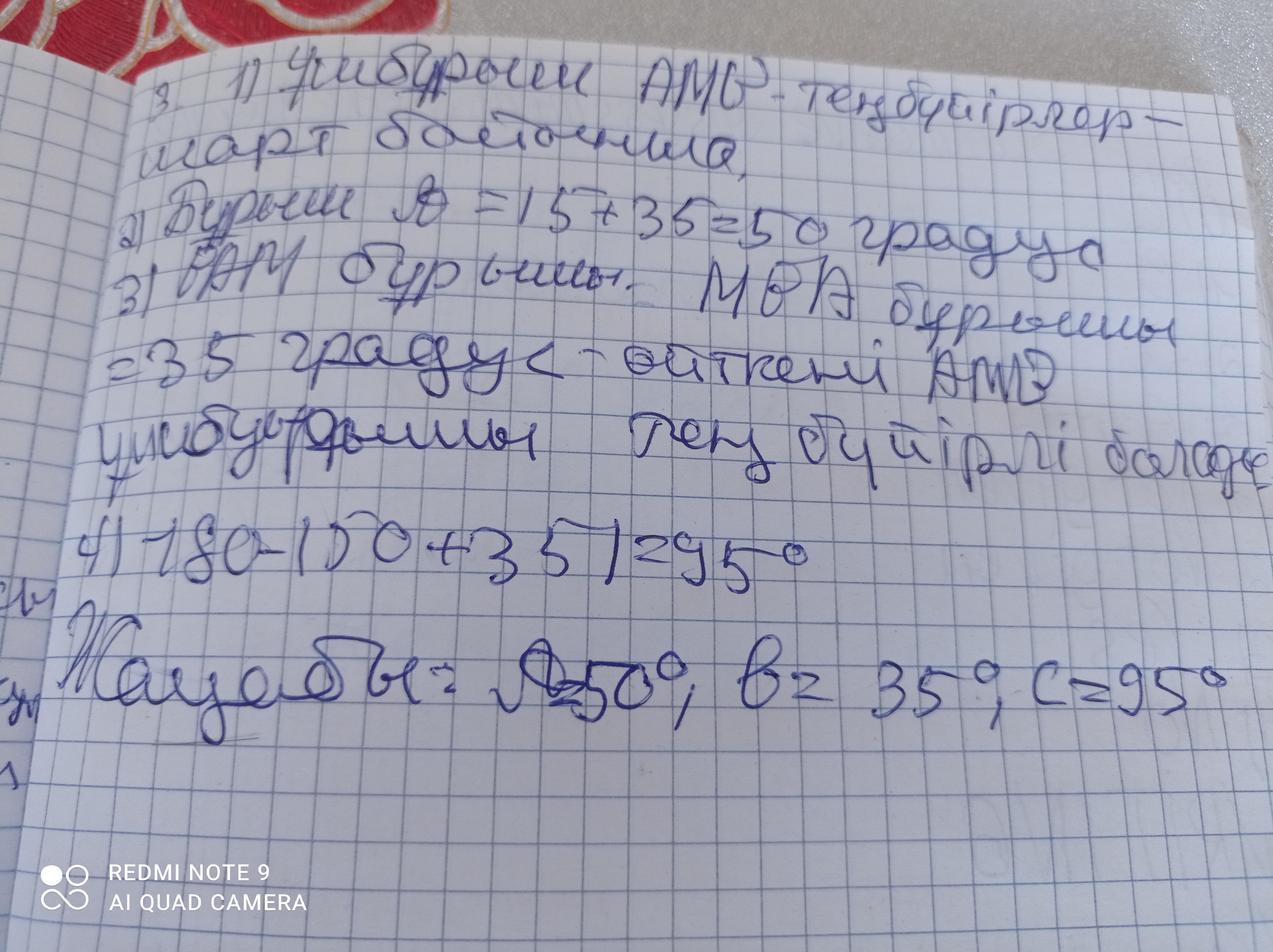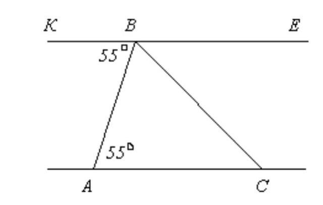 АВС үшбұрышының А төбесінен өтетін түзу ВС қабырғасын К нүктесінде қияды және ВК=АВ, ∠BAK=35°,∠CAK=15°.ABC үшбұрышының бұрыштарын табыңыз.