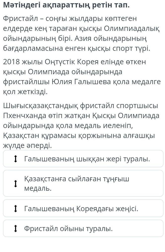 Фристайл ойыны туралы. Галышеваның Кореядағы жеңісі. Галышеваның шыққан жері туралы. Казақстанға сыйлаған тұңғыш медаль. Это и есть правильная последовательность