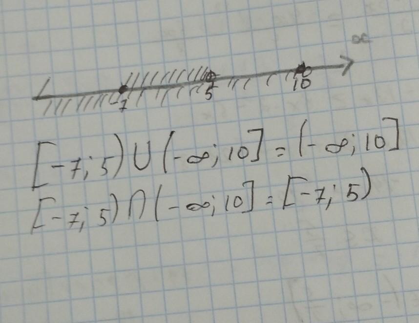 Определите пересечение и объединение числовых промежутков −7; 5 и (−∞; 10]