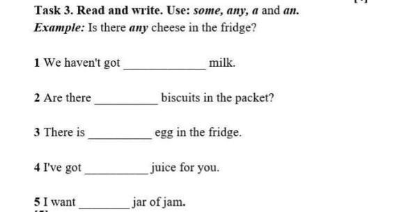 Ответ: 1. Any, 2. Any, 3. An, 4. Some, 5. A