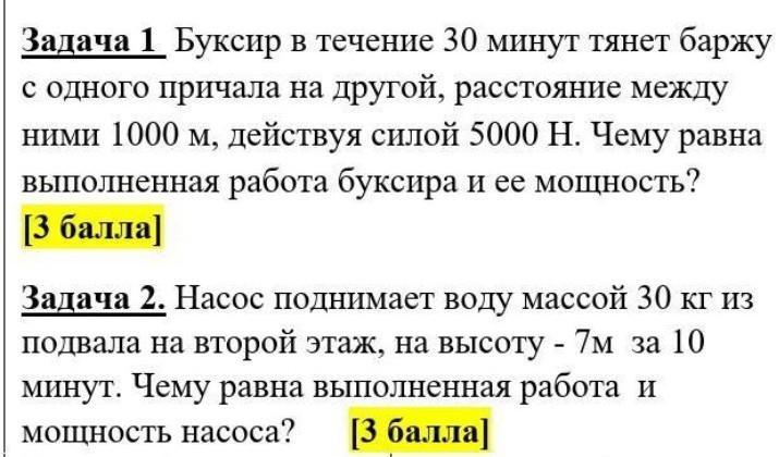Задача 1 Буксир в течение 30 минут тянет баржу с одного причала на другой, расстояние между ними 1000 м, действуя силой 5000 Н. Чему равна выполненная работа буксира и ее мощность?