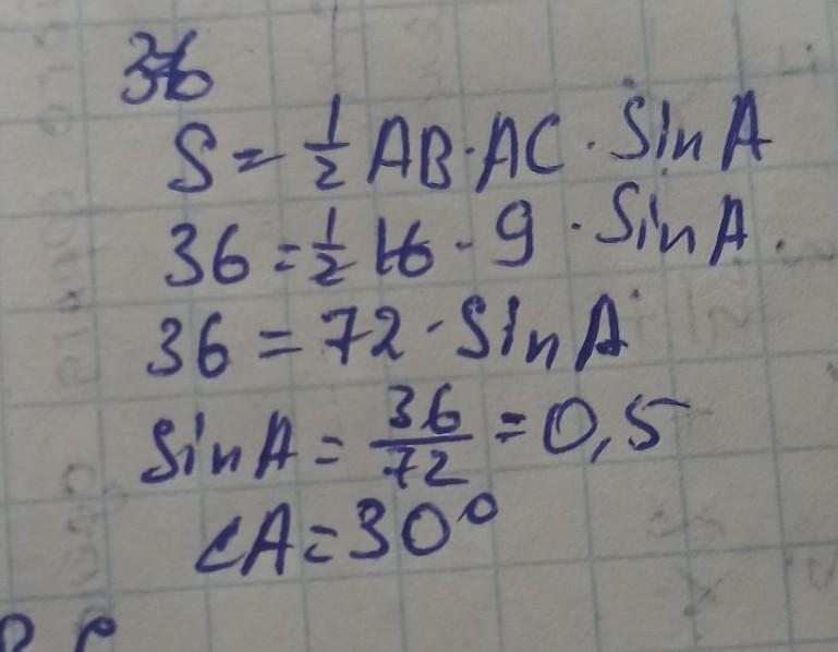 Площадь треугольника ABC равна 36 см^2. AB = 16 см,AC = 9 см. Найдите величину угла BAC