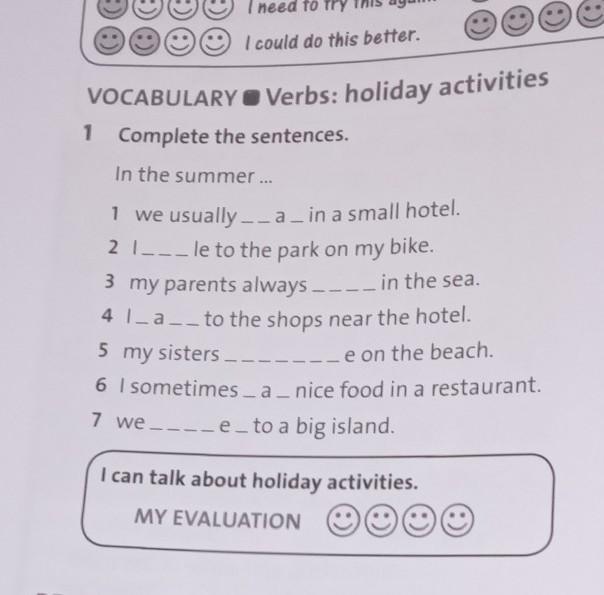 1) We usually stay in a small hotel. 2) I ride bike. to the park on my 3) My parents always swim in the sea. 4) I went to the shops near the hotel. 5) My sisters sunbathe on the beach. 6) I sometimes eat nice food in a restaurant 7) We sailed to a big island.