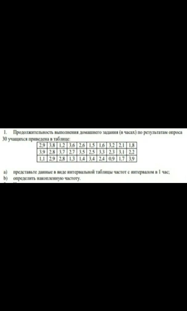 продолжительность выполнения домашнего задания в часах по результатам опроса 30 учащихся провели в таблицы а) представьте данные в виде интервальная таблица частот с интервалом в один час