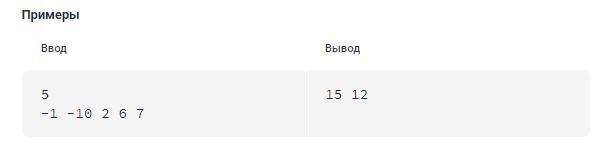 В единственную строку нужно вывести два числа, разделенных пробелом: сумму положительных элементов и произведение чисел, расположенных между минимальным и максимальным элементами. Значения суммы и произведения не превышают по модулю 106.