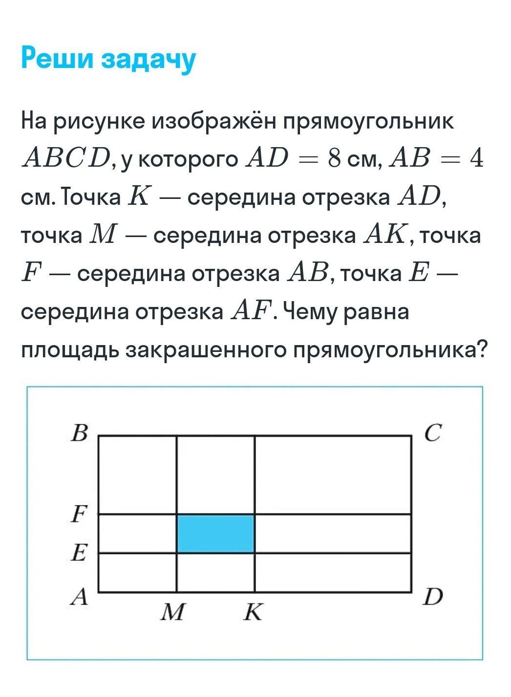 На рисунке изображён прямоугольник ABCD, у которого AD=8 cм, AB= 4 см. Точка K- передина отвезка AK, точка F- середина отрезка AB, Точка E- Середина отрезка AF. чему равна площадь закрашенного прямоугольника?