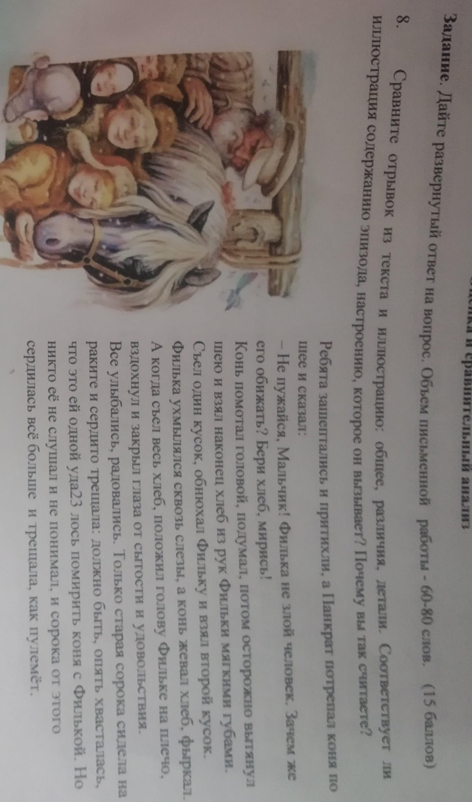 Мне кажется что отрывок в тесте красиво входит в тект.Все предложения очень вписываются в картину если бы они могли двигатся...Лишь одно различие-на рисунке не изаброжена ворона.Эта картина чисто передает настроение и переживания Фильки.Также ворона сильно ошибается ведь не она сдружила Фильку и коня а умный старик Панкрат.