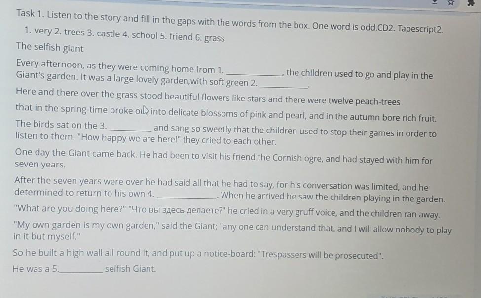 1. Listen to the story and fill in the gaps with the words from the box. One word is odd