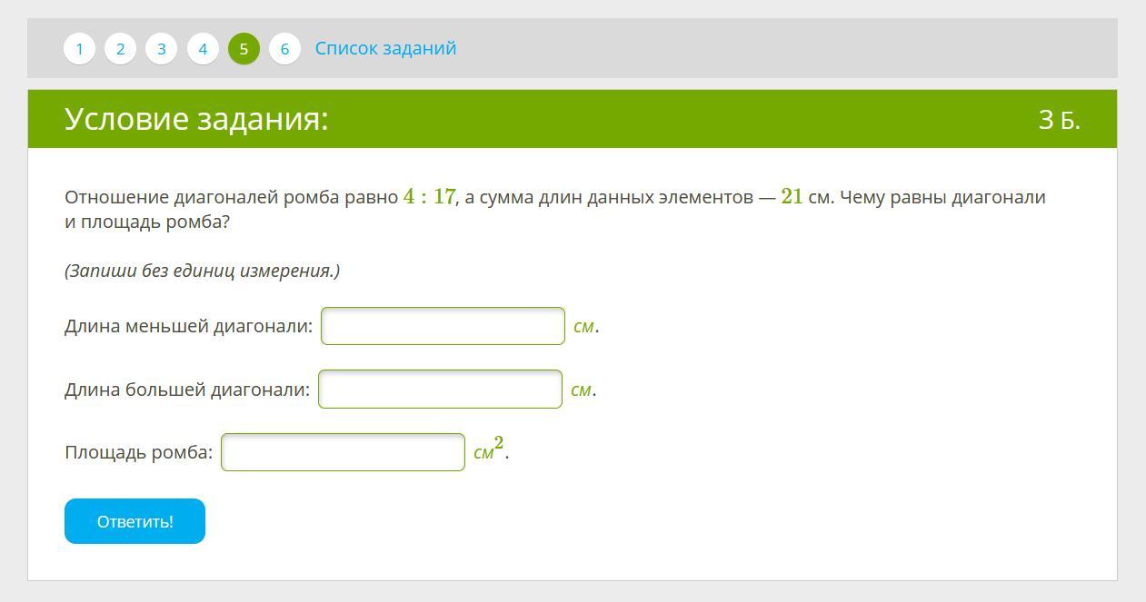 Ромб - параллелограмм, у которого все стороны равны, следовательно диагонали пересекаются под прямым углом и в точке пересечения делятся пополам. У ромба есть тупые и острые углы, и есть меньшая и большая диагональ.
