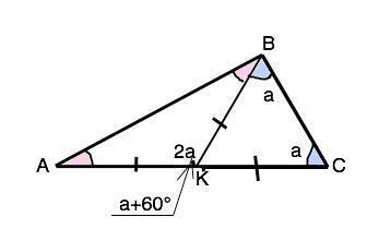 в треугольнике АВС на стороне АС взята точка К. .АК= КС= ВК. угол АКВ на 60° больше угла С. Найдите угол АВК(срочно)