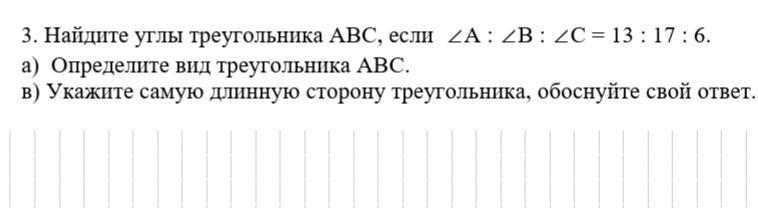 3. Найдите углы треугольника АВС, если ∠А : ∠В : ∠С = 13 : 17 : 6.