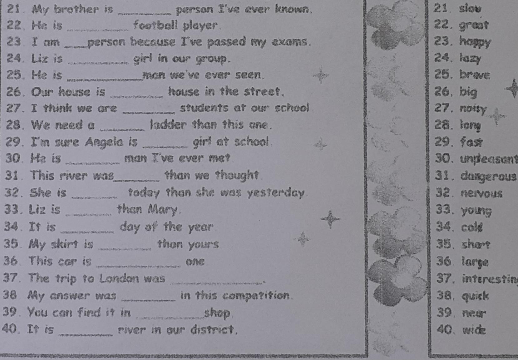 Вставляешь слова справа заместо прочерков, заменяя окончания. Например: We need a longer ladder than this one. Не можем сказать long ladder, получится "нам нужна длинная лестница, чем эта". Добавляешь окончание er или т.п., поищи в интернете про сравнительную степень в английском языке.