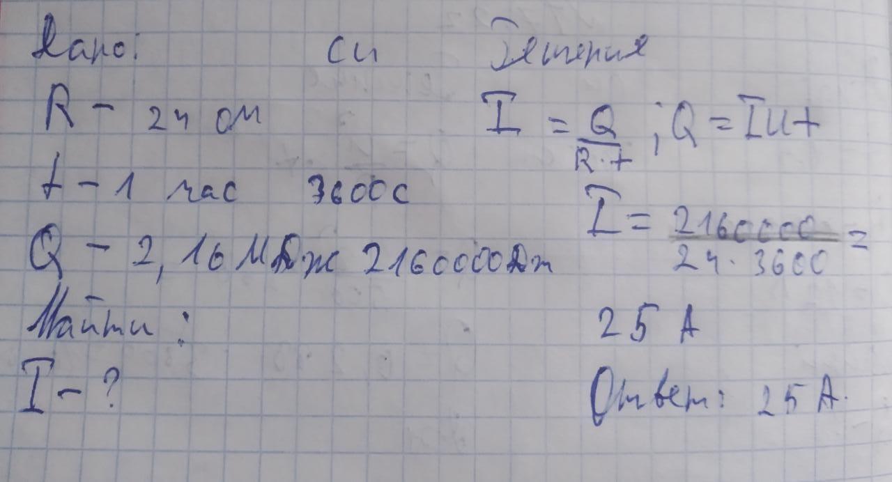 через электрический утюг сопротивлением 24ом при работе выделяет за 1 ч количество теплоты 2,16 МДж. Определите силу тока утюга.