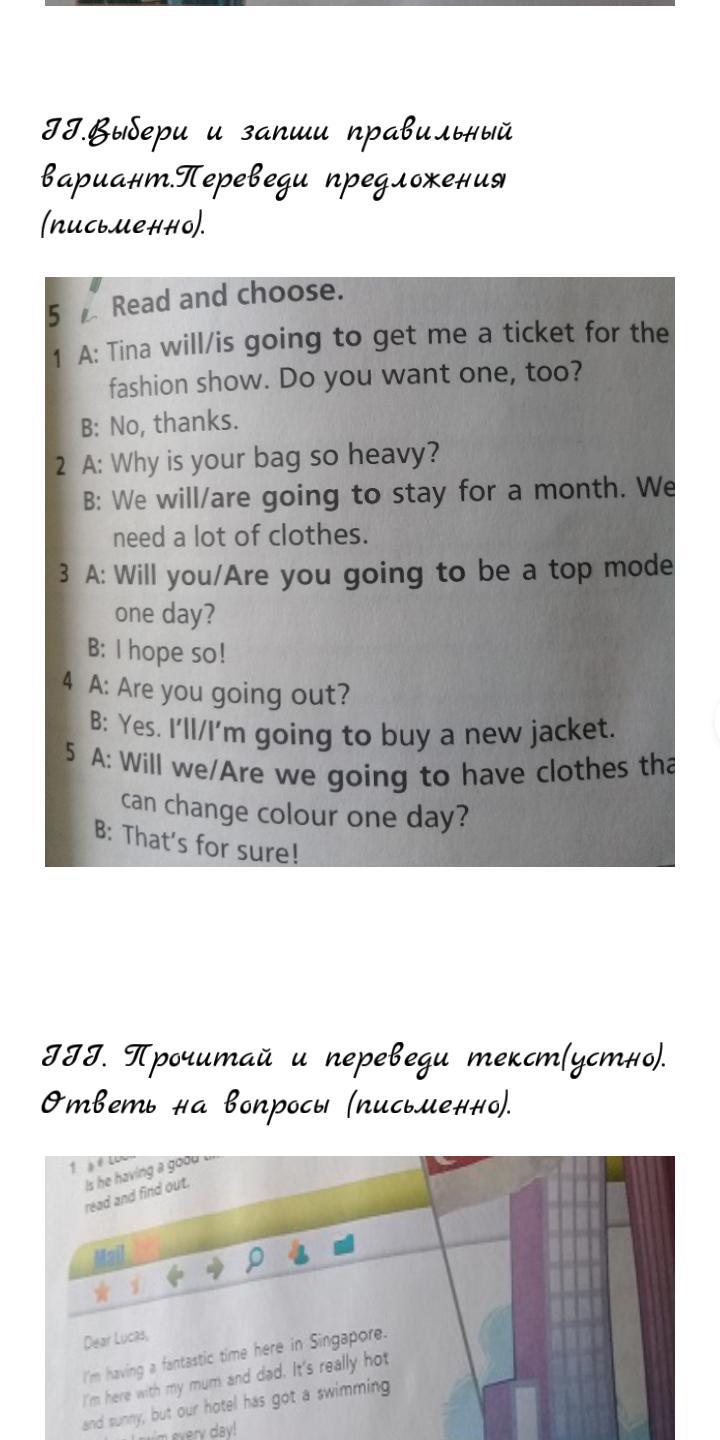1A: Тина принесет / собирается достать мне билет на показ мод. Ты тоже хочешь? B: Нет, спасибо. 2 A: Почему ваша сумка такая тяжелая? B: Мы будем / собираемся остаться на месяц. Нам нужно много одежды. 3 A: Будете ли вы / собираетесь ли вы когда-нибудь стать топ-модом? B: Надеюсь! 4 А: Вы собираетесь гулять? Б: Да. Я собираюсь купить новую куртку. 5 A: Будет ли у нас одежда, которая однажды изменит цвет? B: Это точно!