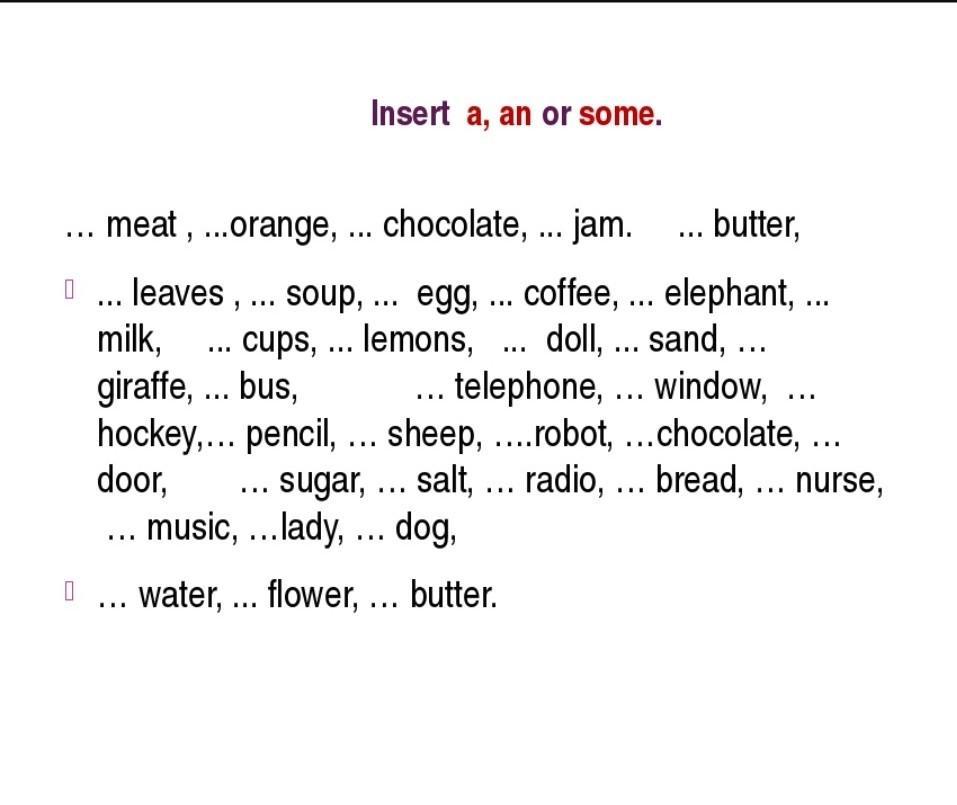 some meat, an orange, a chocolate, some jam, some butter, some leaves, some soup, an egg, sone coffee, an elephant, some milk, some cups, some lemons, a doll, some sand, a giraffe, a bus, a telephone, a window, a hockey, a pencil, a sheep (or some sheep if it's plural), a robot, a door, some sugar, some salt, a radio, some bread, a nurse, some music, a lady, a dog, sone water, a flower.