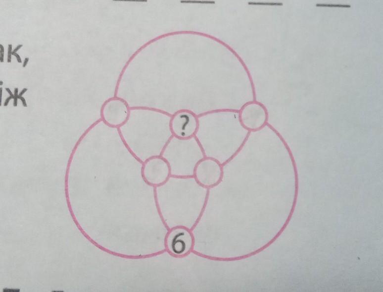 числа від 1 до 6 записали в кружечках на перетині кіл. число 6 розміщено так як зображено на малюнку. суми чисел записаних на кожному з кіл рівні між собою. яке число записали замість знака питання?
