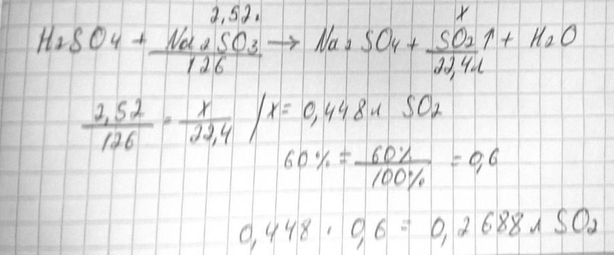 Який об'єм сульфуру 4 оксиду можна добути при дії сульфатної кислоти на 2.52г натрій сульфіту, якщо вихід продукту становить 60%