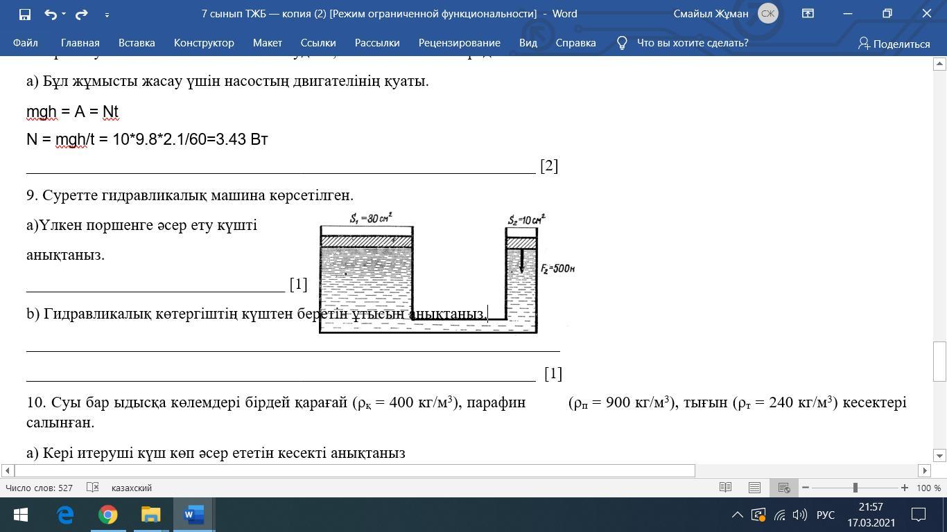 9. Суретте гидравликалық машина көрсетілген. а)Үлкен поршенге әсер ету күшті анықтаныз. b) Гидравликалық көтергіштің күштен беретін ұтысын анықтаныз.