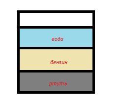 P = pgh h1=h2=h3=10см. : 100 = 0,1. бензин - 780кг/м^3 * 10м/с^2 * 0,1м = 780 Па (делаем так со всеми ) морская вода - 1030 Па , ртуть - 13595 Па , теперь находим давленте на глубине 15 - 780 + половину морской воды = решайте.. дальше находим давление на дно сосуда - морскую воду Па + ртуть Па + бензин Па = решайте