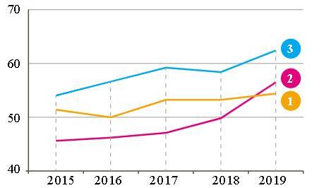На графике изображена динамика сдачи экзаменов по профильной математике, физике и информатике в 2015–2019 годах. Математику в 2019 году сдали лучше физики. Информатика в 2016 году в отличие от физики, растёт, и растёт немного лучше, чем математика. Физика падает в 2016 году.