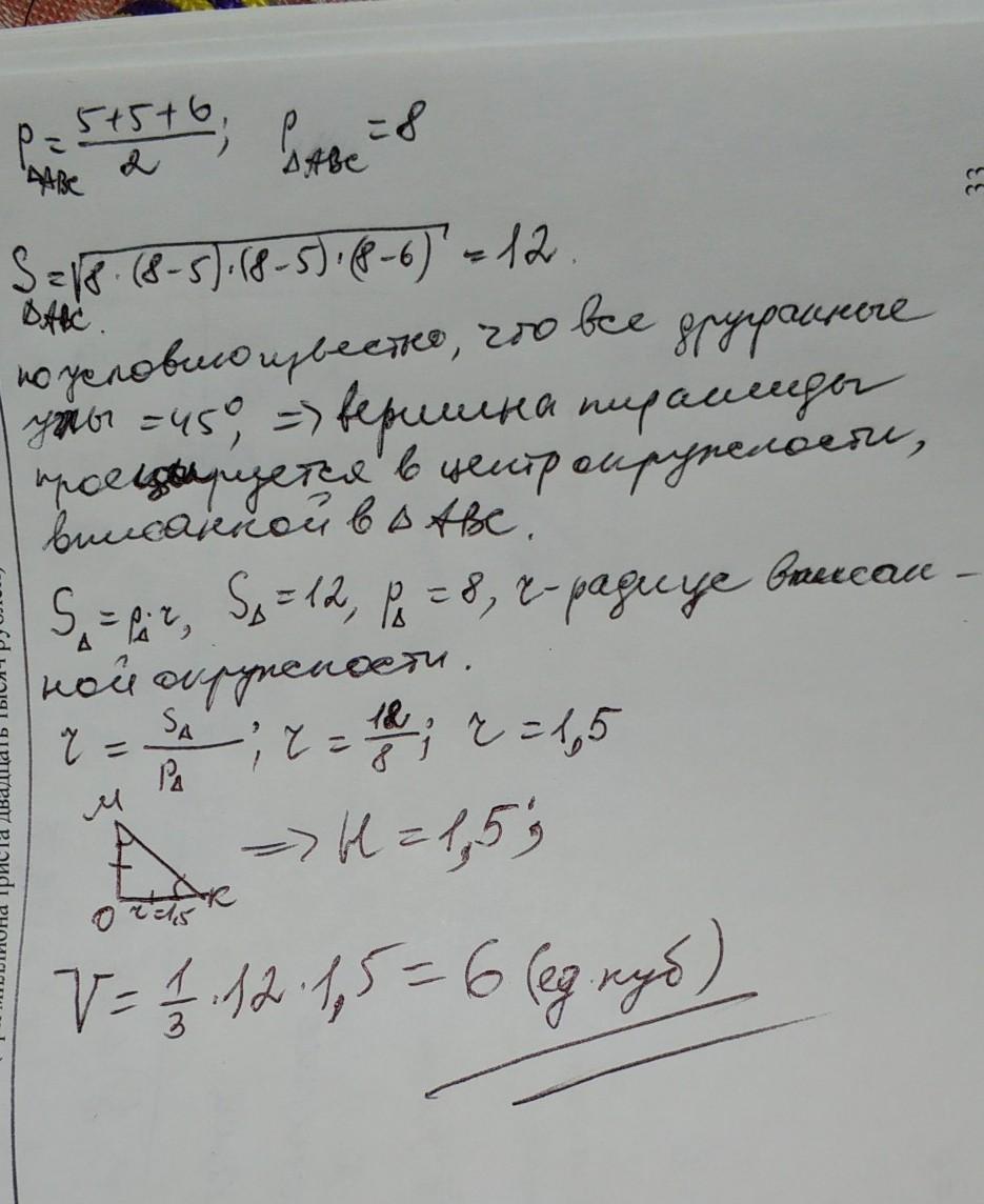 Основание пирамиды - треугольник со сторонами 5,5,6. Боковые грани образуют с основанием равные двугранные углы по 45 градусов. Найти объем пирамиды