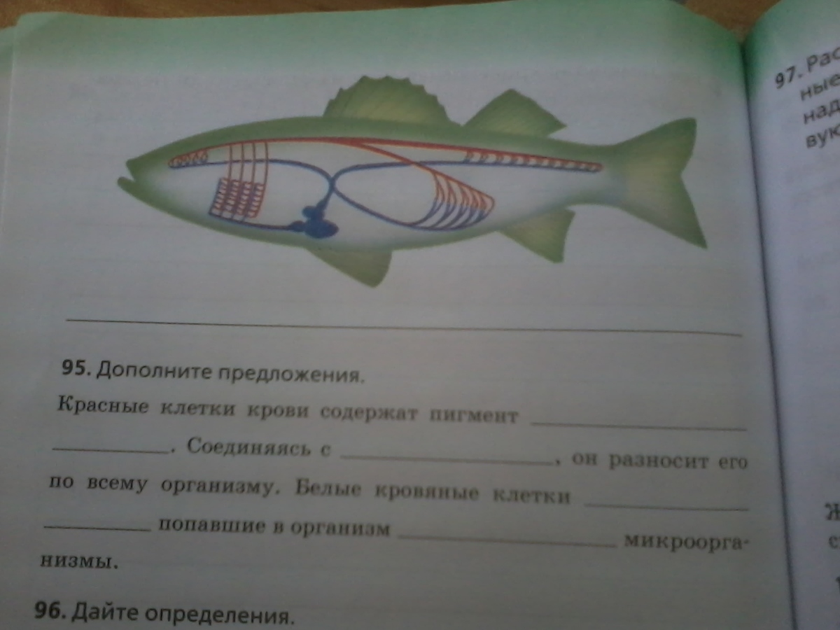 95.Красные кровяные клетки придают крови красный цвет , так как в их состав входит особое вещество - гемоглобин . Соединяясь с кислородом , гемоглобин разносит его по всему организму. Таким образом , кровь выполняет дыхательную функцию. Белые кровяные клетки выполняют защитную функцию: они уничтожают попавшие в организм болезнетворные микроорганизмы.
